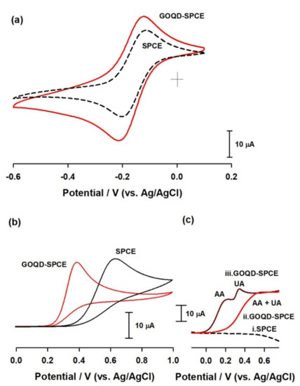 To test the electroanalytical applicability, the GOQD sample was modified directly on a screen-printed carbon surface (SPCE) by drop-casting technique and extended to electrochemical studies. Initial CV experiments were carried out with a standard redox couple, Ru(NH3)63+, which is usually used as an outer sphere probe, and as a functional group-insensitive compound for electrochemical systems [44]. As presented in Figure 10a, there was about a 20% enhanced peak current response on GOQD over respective control SPCE, which may be due to negative charge carried with GOQD and enhanced electronic conductivity effects. Next, simultaneous electrochemical determination of uric acid (UA) and ascorbic acid (AA) were chosen as a model compound due to their importance in a biological system [45,46]. In general, owing to their closer electrochemical oxidation potentials, an overlapped electrochemical oxidation signal was observed while analyzing these compounds. Figure 10c (top) is a typical CV response of simultaneous detection of AA and UA at an unmodified SPCE in pH 8 phosphate buffer solution showing a single peak-overlaid response. Thus, it is a challenging task to develop well-resolved electrochemical signals for the two biomolecules. Interestingly, when the same experiment was repeated with the GOQD-modified SPCE, GOQD-SPCE, well-defined and resolved peaks for the UA and AA were obtained (Figure 10b (bottom)). The negative shift of oxidation peak potential is the specific sign of the improved electrochemical performance of the modified electrode (Figure 10b). This observation is similar to the response noticed with a graphitic oxide-modified SPCE and better than that of the C60 fullerene-modified glassy carbon electrode performance [47,48]. It appears that the oxygen-containing functional groups can not only protect the carbon nanomaterials from aggregation, but also provide hydrogen bonding to enhance the electroanalytical activity (an inner-sphere electron-transfer mechanism).