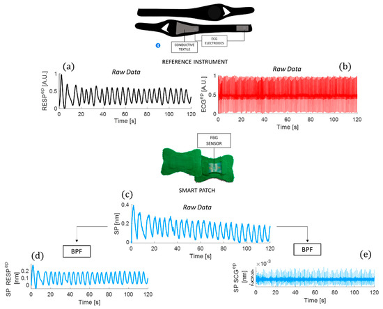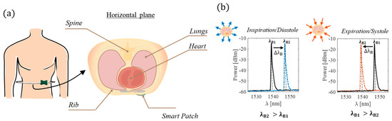 The FBG encapsulation into flexible substrates was proposed to confer a skin-like softness and appearance to the sensor and improve the user acceptability. Thanks to the intrinsic of the FBG sensor and the proper skin adherence of the patch, the proposed system was used to monitor the RR and HR from chest wall deformations. Indeed, when the chest wall expands and contracts due to breathing and heart beating, periodic perturbations occur on the patch surface. These perturbations are transduced into ε at the skin–polymer interface and transferred to the encapsulated FBG, causing a ΔλB, accordingly.