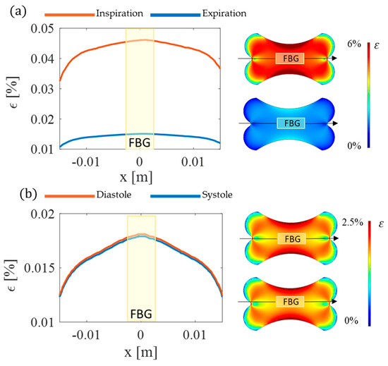 Summary of computational studies highlighting (a) the effects of breathing (blue line refers to inspiration and orange line to expiration) and (b) the effects of heart beating (blue line refers to systole and orange line to diastole) on the optical fiber and the FBG sensor.
