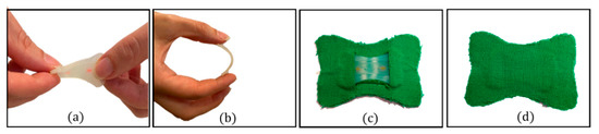 The silicon rubber (i.e., Dragon SkinTM 20) served as an encapsulating layer for the FBG sensor to improve the system adherence to the skin and robustness (see Figure 6a,b). The fabric liners allowed to enlarge the flexible matrix contact surface with the skin and facilitated the skin–sensor coupling (see Figure 6c,d).