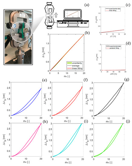 The best-fitting curve was computed to model the ΔλB vs. ΔRH. A parabolic response described by was found (see Figure 7d) with a sensitivity to RH () ~0.0002 nm·RH−1 evaluated as: