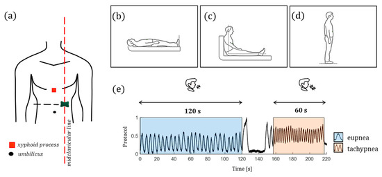 (a) The sensor positioning and the assumed body positions: (b) supine; (c) sitting, and (d) standing; (e) the experimental protocol: the 120 s of eupnea in the blue-colored background and the 60 s of tachypnea in the orange-colored background.