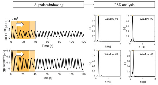The estimation of RR and HR values from the filtered signals was performed in the frequency domain following Welch’s method to estimate the power spectral density (PSD) and by implementing an overlapping sliding window analysis [50]. For the respiratory signals, the overlap between adjacent windows was set to 10 s, while it was set to 5 s for the cardiac signals. This setting considers differences between typical respiratory and cardiac timing. For each overlapping window, the PSD was estimated, and the dominant frequency of each spectrum was evaluated as the frequency value at which the maximum peak of the spectrum is located. Figure 10 shows an example of signal windowing with the corresponding PSD spectrum.