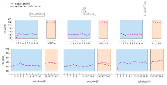 Therefore, the RR and HR values estimated by the smart patch and the reference system were obtained from the PSD dominant frequency and expressed in apm and bpm, respectively. The windowed values of RR and HR of a subject (i.e., S1) in the three assumed positions during eupnea and tachypnea are shown in Figure 11.
