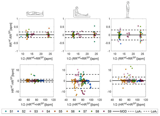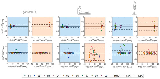 Bland–Altman plots: MOD (black line) and LOAs (black dotted lines) related to RR and HR in supine, sitting, and standing positions.