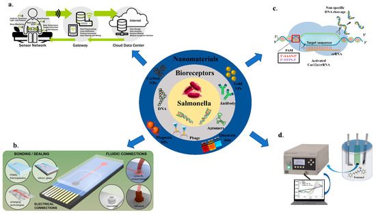 An overview of biosensors for the detection of Salmonella; (a) IOT-based; Adapted with permission from Ref. [17]. Copyright 2018, Elsevier. (b) Microfluidics based; Adapted with permission from Ref. [18]. Copyright 2015, Elsevier. (c) CRISPR/Cas-based; (d) Potentiometry-based biosensing.