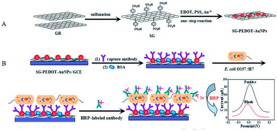 Principle of the sandwich assay. (A) Synthesis of sulfonated graphene (SG-PEDOT-AuNPs) composites and Poly-(3,4- 444 ethylenedioxythiophene) (PEDOT) in a single step reaction; (B) Schematic representation of electrochemical reaction where antibody was bound on the surface of glassy carbon electrode and detection of target by change in current. Adapted with permission from Ref. [82]. Copyright 2020, Elsevier.