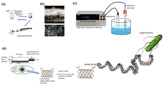 Fabrication of aptasensor on glassy carbon electrode (GCE). (a) Carbon nanotube deposition of on the surface of GCE; (b) Deposition of single-walled carbon nanotubes (SWCNTs) on GCE observed by (ESEM) environmental scanning electron microscope (representing a view from surface and lateral side). The surface view explains about the layer completely covering whole surface and the lateral view displays homogeneous height of the layer; (c) Potentiometric analysis; (d) Representation of an aptasensor for potentiometric analysis with specific aptamers functionalized with carboxylated SWCNTs and the correlation between the target bacteria and aptamer (Gustavo et al., 2013). Adapted with permission from Ref. [88]. Copyright 2013, Elsevier.