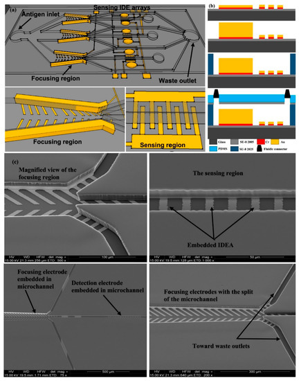 Impedance-based biosensor for Salmonella detection. (a) Representation of sensor based upon impedance, zoomed image of focusing and detection electrodes; (b) Image showing cross-sectional analysis of the layers fabricated in the biosensor including electroplated vertical walls, thin film electrodes with patterned structure, PDMS cover, fluidic connectors and SU8 2025 microchannel (c) SEM image of the fabricated device explaining the enlarged view of the detection region and focused region depicting the microchannel split. Adapted with permission from Ref. [100]. Copyright 2017, Elsevier.