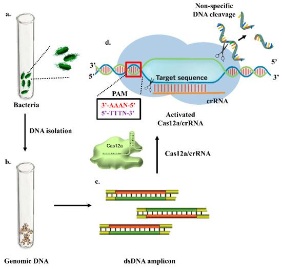 CRISPR based detection of Salmonella. (a) Bacterial culture; (b) Bacterial genomic DNA isolation; (c) dsDNA amplicon generation; (d) Binding of Cas12-crRNA complex with target DNA leading to trans-cleavage activity.