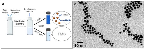 (a) Scheme of the two-step colorimetric method for the detection of cisplatin. In the presence of the chemotherapeutic drug, the reducing agent quickly promotes the formation of small (ca. 4 nm diameter) monodisperse PtNPs, which in turn catalyze the oxidation of the TMB chromogen, with consequent formation of a visible blue color. In the absence of cisplatin contaminations, the solution remains transparent. (b) Representative TEM image of the PtNPs formed from cisplatin.