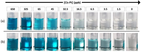Representative colorimetric results of the assay, after 5 min color development. (a) Color change obtained at different concentrations of cisplatin (LOD ~30 ppb) in the standard configuration. (b) Colorimetric results in the enhanced configuration of the test (LOD ~3 ppb).