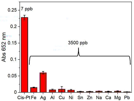 After we maximized the test sensitivity, we proved its specificity, because real samples could contain various metal cations that need to be discriminated by the assay to avoid false positive results. We thus analyzed the selectivity of the proposed method, by evaluating the effect of different ions, at a concentration 1000 times higher than the test LOD. As shown in Figure 3, only cisplatin could induce a clear colorimetric response, with a significant increase in absorption at 652 nm (corresponding to the generation of an intense blue color), unlike the other cations analyzed, which did not produce any significant spectral changes, with the relative solutions remaining transparent. Only in the case of silver ions, a slight increase in the absorbance value occurred, but only for very high concentrations (3500 ppb), extremely unlikely in biological fluids or in hospital environment. The high selectivity of the test is due to the unique capacity of cisplatin, with respect to other metals tested herein, to combine the efficient formation of nanoparticles with their very high peroxidase activity generating the colorimetric readout.