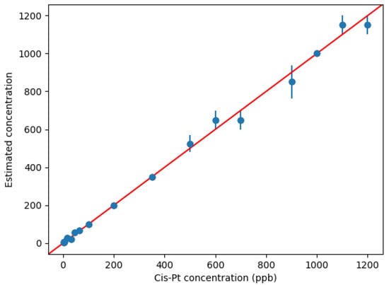 Quantitative measurements by ML: on the y-axis, the values predicted by the ML method are shown against the experimental concentrations of cisplatin (on the x-axis). For each concentration, the average value of the prediction is displayed by using a dot (the bars indicate the corresponding standard deviations). The red line sets the reference for the correct prediction.