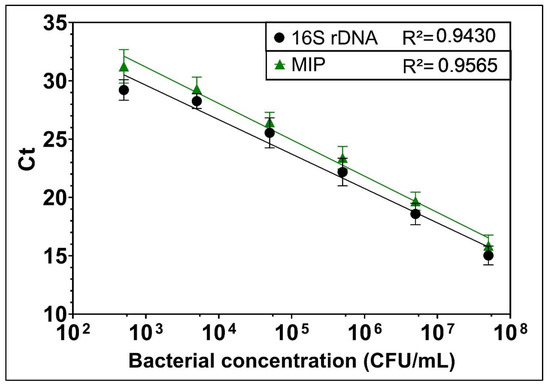 Correlation of Ct values derived from second derivative of PCR amplification using 16S ribosomal DNA universal bacterial primers and MIP gene primers specific for L. pneumophila with bacterial suspensions at different concentrations in microplate wells (n = 15). The results were fitted for MIP and 16S DNA as Ct = 40.532 ± 3.117 × log(10) and 38.487 ± 2.953 × log(10), respectively. Error bars are shown to indicate standard deviation.