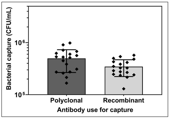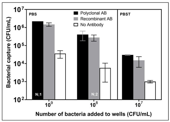 To estimate the saturation level of an Ab-coated surface, Ab-coated wells were exposed to various concentrations of bacteria. It was presumed that in order to compare the ability of pAb and recAb to capture bacteria, it would be necessary to use bacterial concentrations that did not saturate the surface, as results would be expected to plateau with saturating concentrations and variation in conditions might not affect the values. The highest concentration tested was 109 CFU/mL, and it provided the highest bacterial capture, as shown in Figure 2.