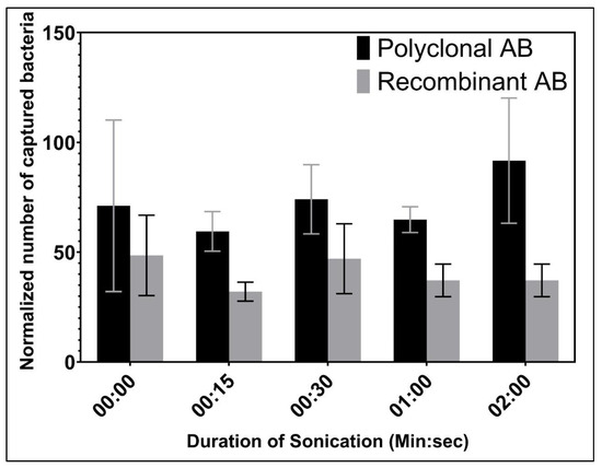 Since only 0.1–1% of the total bacteria in the suspension were captured by Ab attached to the wells, we hypothesized that we lost some of the Ab capacity due to the presence of Ab aggregates. To reduce potential Ab aggregation, the Ab solutions were sonicated before adsorption to the wells to enhance bacterial capture. Figure 3 shows that different durations of sonication for both recAb and pAb did not significantly improve bacterial capture.