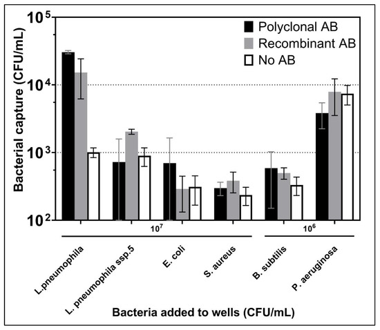 This indicated that Ab wells did not capture non-target bacteria significantly. However, L. pneumophila ssp 5 did show significant capture with recAb (2.0 × 103 CFU/mL), albeit nearly 10 times less than the capture of L. pneumophila ssp 1 (1.5 × 104 CFU/mL).