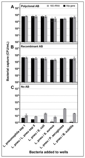 It was observed that other bacteria did not adhere to the surface in the presence of attached L. pneumophila, as there was no increase in the 16S rDNA (grey columns) compared to the MIP (black columns) when other bacteria were added. The highest rate of non-specific attachment in wells not coated with Ab was observed with P. aeruginosa as follows: 1.2 × 104 CFU/mL (Figure 5C), but this high non-specific attachment did not affect capture levels of L. pneumophila with Ab even when 16S primers and probe were used for evaluation (Figure 5A,B). This observation was also noted with all other bacteria mixtures. This result suggested that the Ab-L. pneumophila complex absorbed to the surface had acted as a blocking agent, preventing further binding of the non-target bacteria.