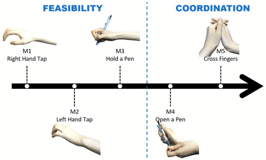 Tasks in the experiment. M1–M3 were to examine the feasibility, and M4–M5 were set for coordination. M1: move specific right fingers according to the auditory code; M2: move specific left fingers according to the auditory code; M3: make the gesture of holding a pen and ready to write; M4: unscrew the pen; M5: fingers of both hands cross over each other.
