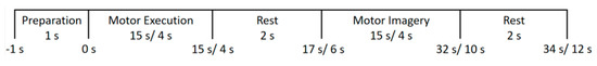 Timing paradigm of one trial: the duration of motor execution can be 15 s (tapping each finger for 3 s) or 4 s (other tasks); the endpoint of motor imagery depends on the participant’s self-regarded “completion”. The overall time course is estimated and denoted at the bottom. It can vary between subjects and tasks.