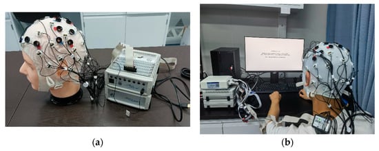 (a) The EEG system used in our study; (b) the recording scene: a participant is following the instructions showing on the screen when the EEG signals are recorded.