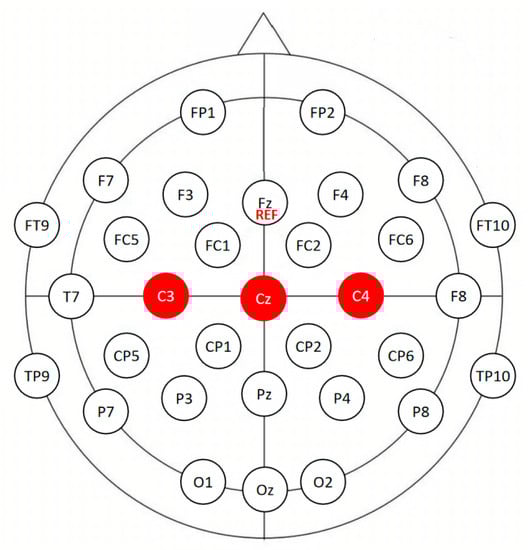 The 32-channel EEG recording montage used in our experiments. Channels C3, C4, and Cz are in the mid-central area, marked as red circles. REF denotes that Fz is the reference electrode.