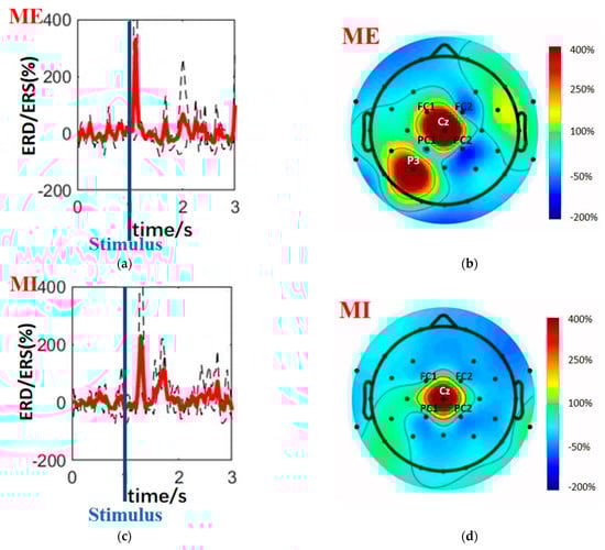 Figure 5 demonstrates the difference between ME and MI in both the time and spatial domains. In the time domain, ME and MI have a distinction in amplitude, time delay, and latency. Figure 5a (ME) and Figure 5c (MI) illustrate it as ERD/ERS time courses during the same finger-tapping movement (motion Tap: Right Finger 1), with dashed lines from five different individuals while bold red lines delineating the average time course across these subjects. Beta rebounds are represented as peaks in these lines. “Stimulus” marks the time when subjects hear the auditory instructions. Compared with ME, the beta rebounds of MI have smaller amplitude, appear later after stimulus, and last longer. In the spatial domain, ME and MI have different topographic distributions. Figure 5b (ME) and Figure 5d (MI) demonstrate it with topo-plots (topographic maps of EEG fields in a circular 2D view looking down at the top of the head) depicting ERD/ERS distribution. These topo-plots are from subject S01 for motion Tap: Right Finger 1 at the time when the beta rebound is the most remarkable (ME: 1.624 s; MI: 1.818 s). Black dots mark the locations of electrodes. ERS is in red while ERD is in blue. During the MI task (Figure 5d), the beta rebound was constrained within the mid-central areas (channel Cz). In contrast, the rebound of ME (Figure 5b) had a more enormous scope of influence, affecting adjacent electrodes (channels Cz, FC1, FC2, PC1, PC2, and P3). Cz and the surrounded channels are related to sensorimotor cortex, which accounts for the peak at the mid-central areas. The other peak at channel P3 may attribute to the touch sensation function of parietal lobe, which only occur during ME. To conclude, in the time domain, there is a high probability that beta rebounds of lower intensity, higher latency, and longer duration indicate MIs instead of MEs; in the spatial domain, if beta rebounds mainly affect channel Cz, it will most likely represent MIs.