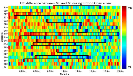 Color map of the differences between ME and MI tasks during the motion, open a pen. Red blocks show ERS during ME, while blue blocks represent ERS during MI. In most cases, a “follow-up” pattern—a red block followed by a blue block—can be observed, marked by the black frames.