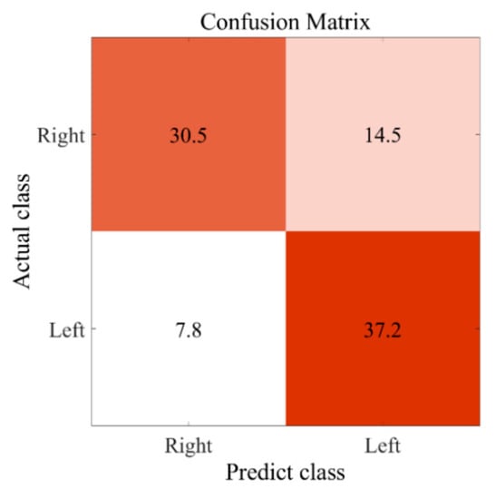 We adopted different derivatives of SLR to select features and to calculate weights. The number of features left and the corresponding accuracies are shown in Table 5. Among all the models adopted, L1-SLR-LAP, which applied Laplacian approximation and L1-norm in SLR learning, attained the best performance. The accuracy of L1-SLR-LAP is 75.22%, and the corresponding confusion matrix is displayed in Figure 7. Note that the values here are the average number of 10-fold cross-validation. Higher accuracy was achieved in left-hand MI. Forty-two feature vectors were left after the selection procedure in L1-SLR-LAP. By checking their weights, we found that power features and SampEn displayed distinctive weights in the remaining vectors, which indicated that they were primary factors in the classification task.