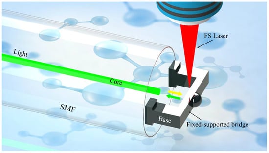 Two-photon printing (TPP) technology induced by a femtosecond laser is a new type of 3D microfabrication technology [,]. It has been applied in micro-instruments [,], microfluidics [,], etc. Due to the ultra-high printing accuracy of TPP technology (typical resolution is less than 100 nm), some functional microstructures that were difficult to fabricate by using conventional micromachining technology had been printed, such as micro-biomimetic or micro-magnetic driving mechanical structures [,,]. By applying TPP technology, various new types of optical fiber sensors [] have also been developed and reported in recent years. For example, Melissinaki et al. fabricated a micro FP cavity on the end face of an optical fiber as a vapor sensor []. Xiong et al. applied TPP to make a microcantilever for hydrogen detection []. Zou et al. printed a clamped-beam on the end face of the optical fiber for tiny-force measurements []. However, the above-mentioned optical fiber sensors were all implemented in a gas environment, while biomedical detections were mostly applied for liquid samples. Therefore, achieving stable and accurate detection in liquid environments was necessary for the development of biomedical sensors.