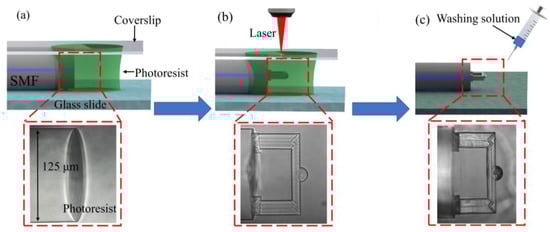 To fabricate the fixed-supported bridge, an SMF (Corning SMF-28, 8.2 μm core diameter) was fixed on a glass slide and its tip was immersed into the photoresist, as shown in Figure 2a. The polymerization process of the micro FP cavity was adopted and shown in Figure 2b [,]. A two-photon polymerization 3D lithography machine (Altechna R&D WOP, FemtoLAB) was used to fabricate structures. A femtosecond laser with a pulse width of 250 fs, a center wavelength of 1026 nm, and a repetition frequency of 200 kHz was applied to perform TPP. A 63× magnification (NA = 1.4) oil-immersion objective lens was used to increase the fabrication accuracy and the smoothness of the microstructure. In this work, the real light spot size was about 0.5 μm and the focal depth was about 3 μm. To ensure the strength of the fabricated microstructure and minimize time cost, the laser power was set at 2 mW and the scanning speed was set at 500 μm/s, respectively. After the polymerization was completed, the microstructure was washed by washing solution (acetone: isopropanol, 1:4) to remove the residual photoresist (Figure 2c). After all the washing solution was evaporated, the microfabrication of the FP cavity was completed.