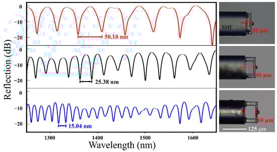 Since the free spectral range (FSR) of interference reflection can be applied to calculate the effective cavity length of the FP cavity sensor, we measured the FSR of the fiber-tip FP interferometer (Figure 3). The reflection spectra of various FP interferometers showed that the FSRs were 50.18 nm, 25.38 nm, and 15.04 nm according to the different dip wavelength λ of 1383 nm, 1375 nm, and 1324.5 nm, respectively. There was a relationship with these parameters according to the formula: