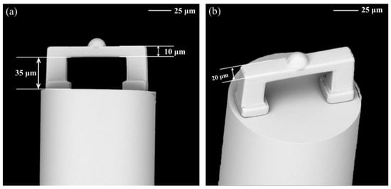 Typical SEM images of the microstructure on the end of the optical fiber manufactured using TPP technology. (a) Front view and (b) top view of the fixed-supported bridge. Scale bar: 25 μm.