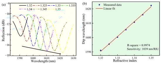 Figure 5a showed the reflectance spectrum when the RI was increased at room temperature. As the RI was increased, the spectrum dip wavelength drifted steadily toward the long wavelength. At 1590 nm, when the RI changes from 1.32 to 1.35, the dip wavelength increased about 32 nm. The dip wavelength shift was plotted as a function of RI in Figure 5b, in which the curve was well fitted by a linear fitting (R2 = 0.9974). The RI sensitivity of the sensor was as high as 1039 nm/RIU.