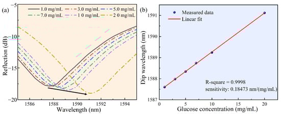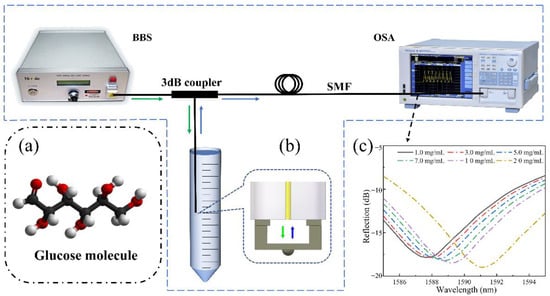 As shown in Figure 6, the sensor-tip was dipped in the glucose solution by a three-dimensional displacement platform. Figure 6a shows a glucose molecular diagram. Figure 6b shows our test schematic, a broadband light source was used as the transmitter and an optical spectrum analyzer was used to record the reflection spectrum. Figure 6c shows the reflection spectrum drift as a function of the measured glucose concentration. Once the FP cavity was filled with the glucose solution, the reflection spectrum drift was immediately recorded and the glucose concentration was calculated. Figure 7a shows the reflection spectrum as a function of glucose concentration. Around the wavelength of 1589 nm, when the glucose concentration changed from 1 mg/mL to 20 mg/mL, the reflection spectrum shifted to the long-wavelength by approximately 3.5 nm. Figure 7b shows the linear curve fitting of the dip wavelength shift as a function of glucose concentration, and it can be obtained that the glucose detection sensitivity of the sensor was 0.18473 nm/(mg/mL) (R2 = 0.9998). It can be calculated that the detection limit of the sensor for blood glucose was 0.4565 mg/mL, which was sufficient for glucose concentration detection of diabetic patients in family healthcare [].