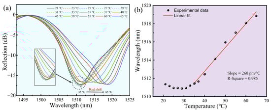 In order to guarantee the stability of the sensor in daily monitoring, we analyzed the temperature response of the sensor. The sensor was placed into an air oven and we gradually increased the temperature from 25 °C to 65 °C, and the temperature was continuously maintained for 10 min in each step. The change in reflectance spectrum with temperature is shown in Figure 8a. The corresponding relationship between the dip wavelength shift of the Fabry-Perot interference spectrum and the temperature is as follows: