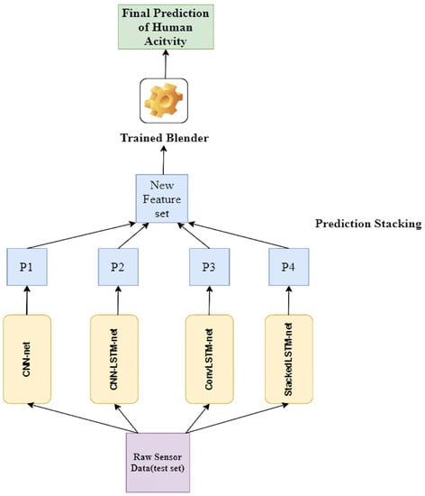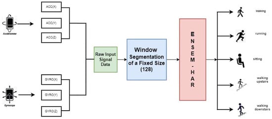 For conducting trials with sensor-based HAR data, information fusion is an intelligent method based on constructing an ensemble of classifiers, although it is essentially unexplored in this sector [3]. The construction of the ensemble is useful as it takes into account the decisions of multiple models instead of depending on a particular single model. Many classification issues, including HAR, have recently benefited from the use of an ensemble of different models. Mukherjee et al. [4], using various combinations such as ‘majority voting’, ‘sum rule’, ‘score fusion’, etc. between existing deep learning classifiers, was able to enhance overall model performance. Das et al. [5] formed an ensemble from the outputs they obtained from models trained on RGB images and sensor data, and observed a significant enhancement in the performance of their HAR model. The key factor in designing an effective ensemble of classification models is the uniqueness of each of the constituent classifiers, as there is no purpose in using them to construct the ensemble if every constituent wrongly predicts a label and they exhibit identical characteristics in the forecasting an instance [3]. Figure 1 shows an overview of our proposed work.
