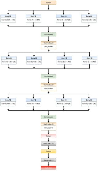 Chen and Xue [7] proposed a CNN model that recognizes simple motions based on the three-axial signals collected from accelerometers integrated into a smartphone. To process the signals, they built a CNN model and changed the convolutional kernel accordingly. Ronao and Cho [8] developed a unique CNN design for extracting complicated features that makes use of an exploited (1 × 91 × 14) convolutional layer with a small pooling size (1 × 2–1 × 3). The proposed method has been tested using raw data and the temporal properties of Fast Fourier Transformed signals using the created CNN.