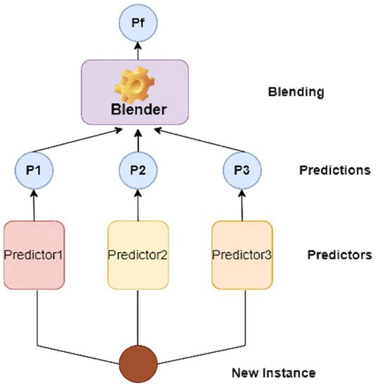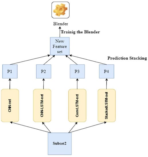 As the blender is trained (in this study, we used a Random Forest Classifier), the predictions based on the test data are taken sequentially (see Figure 9). This is done by taking predictions from the base models or predictors of the first layer on the test set, then stacking those predictions to make a new feature set; finally, the trained blender provides the final prediction on this stacked feature set.