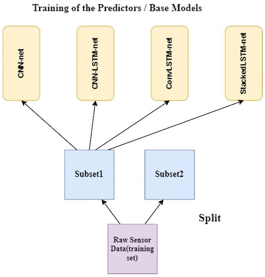 Keeping a hold-out set is a standard method for training a blender. The training data set is initially divided into two subsets. Here, we trained the first layer predictors (or base models) with the first subset (see Figure 7).
