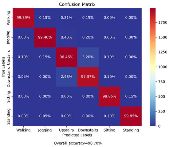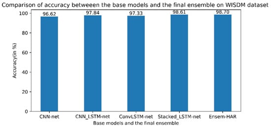 The samples of the pre-processed WISDM dataset were split into the training (70%) and test (30%) datasets for the training of the previously mentioned base models and then for the testing on the ensemble of those models, respectively. The confusion matrix obtained from the evaluation of the trained proposed model on the test data is shown in Figure 10. According to the obtained confusion matrix, the classification accuracy of our proposed model is more than around 97% for all six activity classes and the overall accuracy is 98.71%, whereas the base models, viz., ‘CNN-net’, ‘CNN-LSTM-net’, ‘ConvLSTM-net’, and ‘StackedLSTM-net’, have accuracies of 96.62%, 97.84%, 97.33%, and 98.61%, respectively, as shown in Figure 11.