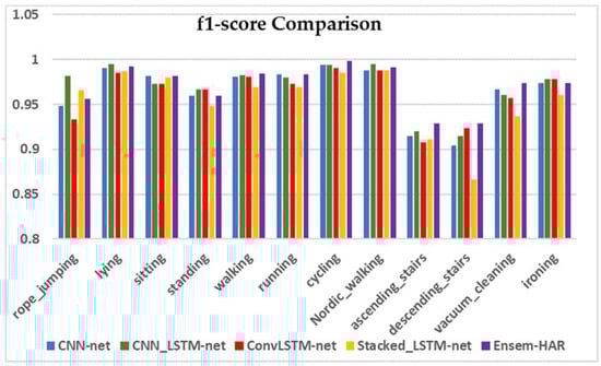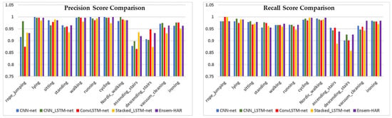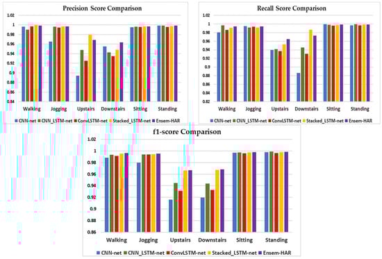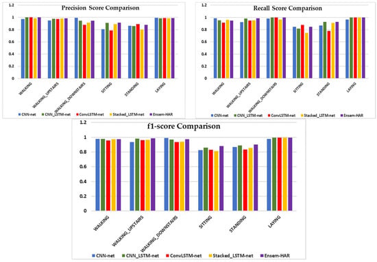 A visual comparison of the four individual base models’ performance, as well as our proposed Ensem-HAR model, in terms of Precision, Recall and F1-score is shown in Figure 12.