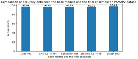 Accuracy (in %) comparison between four base models and Ensem-HAR model on the PAMAP2 dataset.