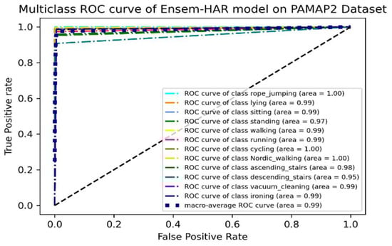 It can be observed from the ROC curve shown in Figure 13 that the area under ROC or AUC of every class with respect to the others is almost ‘1′, which indicates that our proposed model was able to classify all activity classes efficiently, as seen earlier using the confusion matrix.
