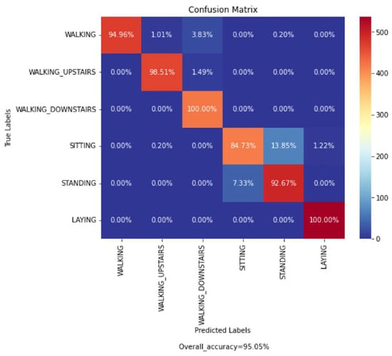 Out of the total samples present in the UCI-HAR dataset, 7352 samples (training data) were used to train each of the proposed base models and 2947 samples were used as testing data to evaluate the performance of our final ensemble model. The confusion matrix obtained from evaluation of the trained proposed model on the test data is shown in Figure 18. According to the obtained confusion matrix, the classification accuracy of our proposed model is greater than 94% in four out of six activity classes, excepting the activity class ‘Sitting’ and ‘Standing’. However, the overall accuracy is 95.05%, where the base models ‘CNN-net’, ‘CNN-LSTM-net’, ‘ConvLSTM-net’, and ‘StackedLSTM-net’ have accuracies of 92.64%, 93.52%, 92.53%, and 92.16%, respectively, as shown in Figure 19.