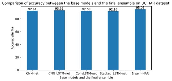 Accuracy (in %) comparison between four base models and Ensem-HAR model on the UCI-HAR dataset.