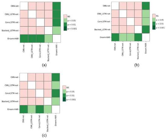 Pairwise Nemenyi score plot generated for: (a) WISDM; (b) PAMAP2; and (c) UCI-HAR datasets.