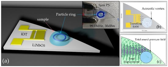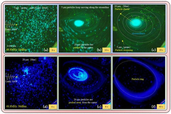 - Fakhfouri, A.; Devendran, C.; Ahmed, A.; Soria, J.; Neild, A. The size dependant behaviour of particles driven by a travelling surface acoustic wave (TSAW). Lab Chip 2018, 18, 3926–3938. [Google Scholar] [CrossRef]