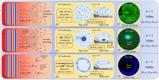 - Destgeer, G.; Cho, H.; Ha, B.H.; Jung, J.H.; Park, J.; Sung, H.J. Acoustofluidic particle manipulation inside a sessile droplet: Four distinct regimes of particle concentration. Lab Chip 2016, 16, 660–667. [Google Scholar] [CrossRef]